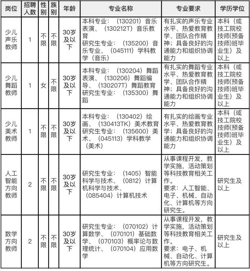因中心发展需要,现面向社会公开招聘事业编制教师7名,其中声乐、舞蹈和美术教师各1名,人工智能方向教师2名,数学方向教师2名。具体见附件1。