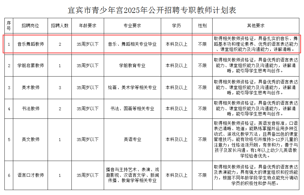 因工作需要,宜宾市青少年宫现面向社会公开招聘专职教师数名。招聘的人员按宜宾市青少年宫劳动合同制管理,现将有关事项公告如下。