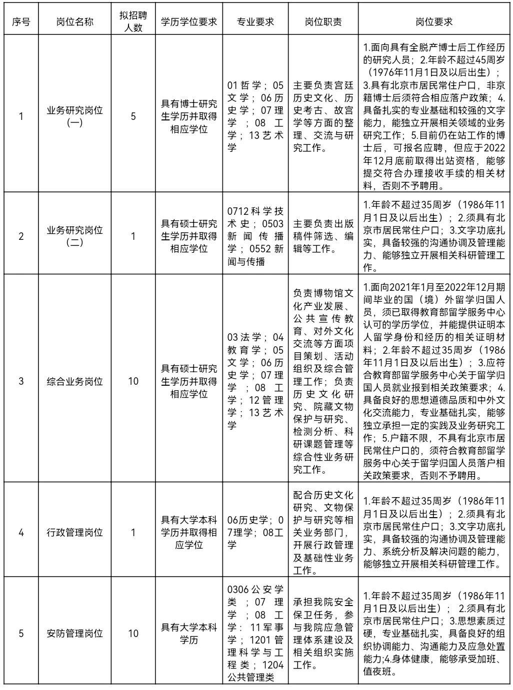 专业参考目录为教育部《学位授予和人才培养学科目录(2018年版)》《普通高等学校本科专业目录(2020年版)》《学位授予单位(不含军队单位)自主设置二级学科名单(截至2020年6月30日)》以及研招网最新信息。岗位学历要求为应聘人员已获得的最高学历,岗位专业要求为应聘人员已获得的最高学历对应专业。对于专业接近但不在上述目录中的,应聘人员可与我院联系确认是否符合岗位要求。四、招聘流程(一)报名和资格审查报名时间:自公告发布之日起至1月6日。报名方式:请点击https://campus.chinahr.com/pages/dpm/,应聘人员需按要求完成在线注册、报名等程序。所填信息应真实、准确、有效。资格审查:我院根据各招聘岗位的条件要求,对应聘人员进行资格审查。如所填信息虚假或未按要求填报,资格审查将不予通过。资格审查贯穿招聘工作全过程,在招聘各环节发现应聘人员不符合报考资格条件的,我院均可取消其报考资格或聘用资格。我院将根据新冠肺炎疫情防控要求,结合实际情况组织通过资格审查的应聘人员参加考试。(二)笔试笔试内容为综合素质测试,同一岗位通过资格审查人数和招聘岗位人数之比不低于5:1方可开考。达不到该比例的,是否按照该岗位通过资格审查的实际人数进行考试,将由我院研究确定。笔试成绩满分100分,笔试成绩60分及以上者有资格进入面试。笔试时间、地点及方式另行通知。(三)面试根据招聘岗位的笔试成绩由高到低排名,按与岗位招聘人数5:1的比例确定进入面试人选,达不到该比例的,按通过合格分数线的实际人数进行面试。如有应聘人员主动放弃面试资格,按照笔试成绩排名顺序依次递补。面试当天,将对应聘人员进行资格复审,因应聘人员自愿放弃、资格复审未通过等原因产生的面试人选空缺,不再递补。 面试成绩满分100分,面试成绩60分及以上者有资格进入考察和体检程序。如同一岗位应聘人员面试成绩均未达到60分,取消该岗位的招聘计划。面试时间、地点及方式另行通知。(四)考察和体检根据综合成绩(综合成绩=笔试成绩×30%+面试成绩×70%)由高到低的顺序,按与岗位招聘人数1:1的比例确定考察和体检人选。考察合格后,组织应聘人员进行体检,体检标准参照公务员体检执行。我院统一组织考察和体检工作。应聘人员考察、体检不合格或自愿放弃应聘的,取消聘用资格,相关岗位不再递补。(五)公示和聘用根据综合成绩、考察和体检结果,经研究确定拟聘用人选。拟聘用人员信息将在中央和国家机关所属事业单位公开招聘服务平台进行公示,公示期为7个工作日。公示无异议后,即按相关规定办理聘用手续。我院按规定实行试用期制度,试用期期间或期满不合格的,取消聘用。试用期满合格的,予以聘用。五、其他事项(一)报名与考试时使用的身份证必须一致。(二)每人限报1个岗位。根据《事业单位人事管理回避规定》,应聘人员不得报考聘用后构成回避关系的岗位。(三)应聘人员所提供的各种材料务必真实、准确、有效,招聘过程中如发现有弄虚作假、舞弊等行为,一经查实,立即取消考试资格及聘用资格。有关违纪违规行为将依照《事业单位公开招聘违纪违规行为处理规定》等进行处理。(四)招聘过程中因电话、短信等通讯不畅导致无法通知到应聘人员本人的,后果由本人负责。(五)本次招聘仅接受网上报名,不接受其他形式报名。(六)招聘全过程均不向应聘人员收取任何费用。(七)在招考组织实施过程中,将按照国家和北京市有关防疫政策要求,落实防疫措施,应聘人员应予以配合。(八)本公告由故宫博物院负责解释。六、联系方式咨询电话:010-85007040咨询时间:工作日上午9:00-11:00 下午14:00-16:00地址:北京市东城区景山前街4号邮编:100009