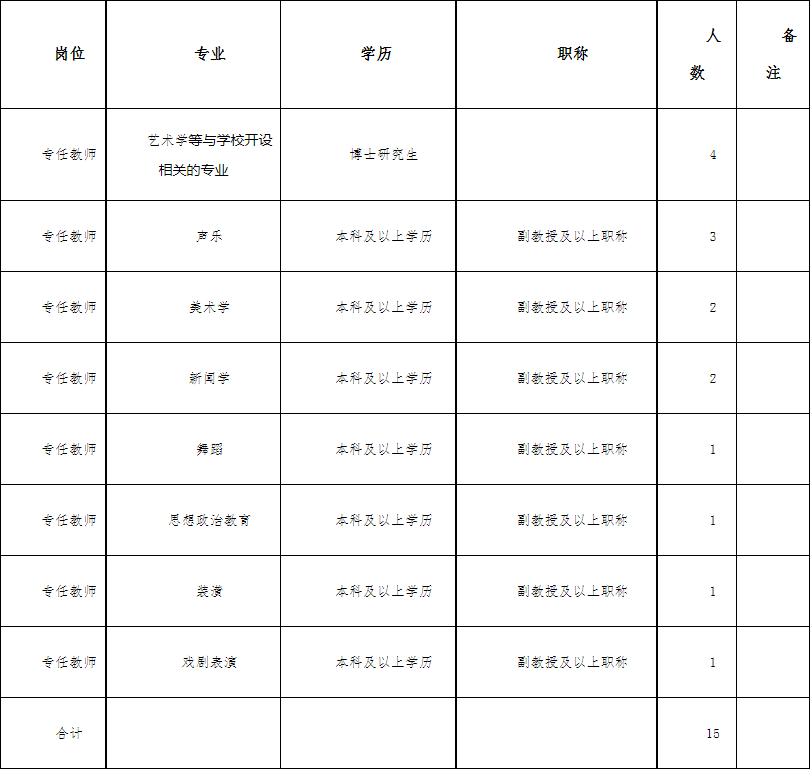 为建设一支高素质人才队伍,促进学校各项事业快速发展,根据中共河南省委组织部、河南省人力资源和社会保障厅《关于印发河南省事业单位公开招聘工作规程的通知》(豫人社〔2015〕55号)文件精神,河南艺术职业学院拟使用全供事业编制考核招聘15名高层次人才(其中:博士研究生4名,副教授11名)和使用经费自理事业编制考核招聘8名紧缺专业人才(其中:研究生及以上学历5名,本科及以上学历3名),特制定方案如下: