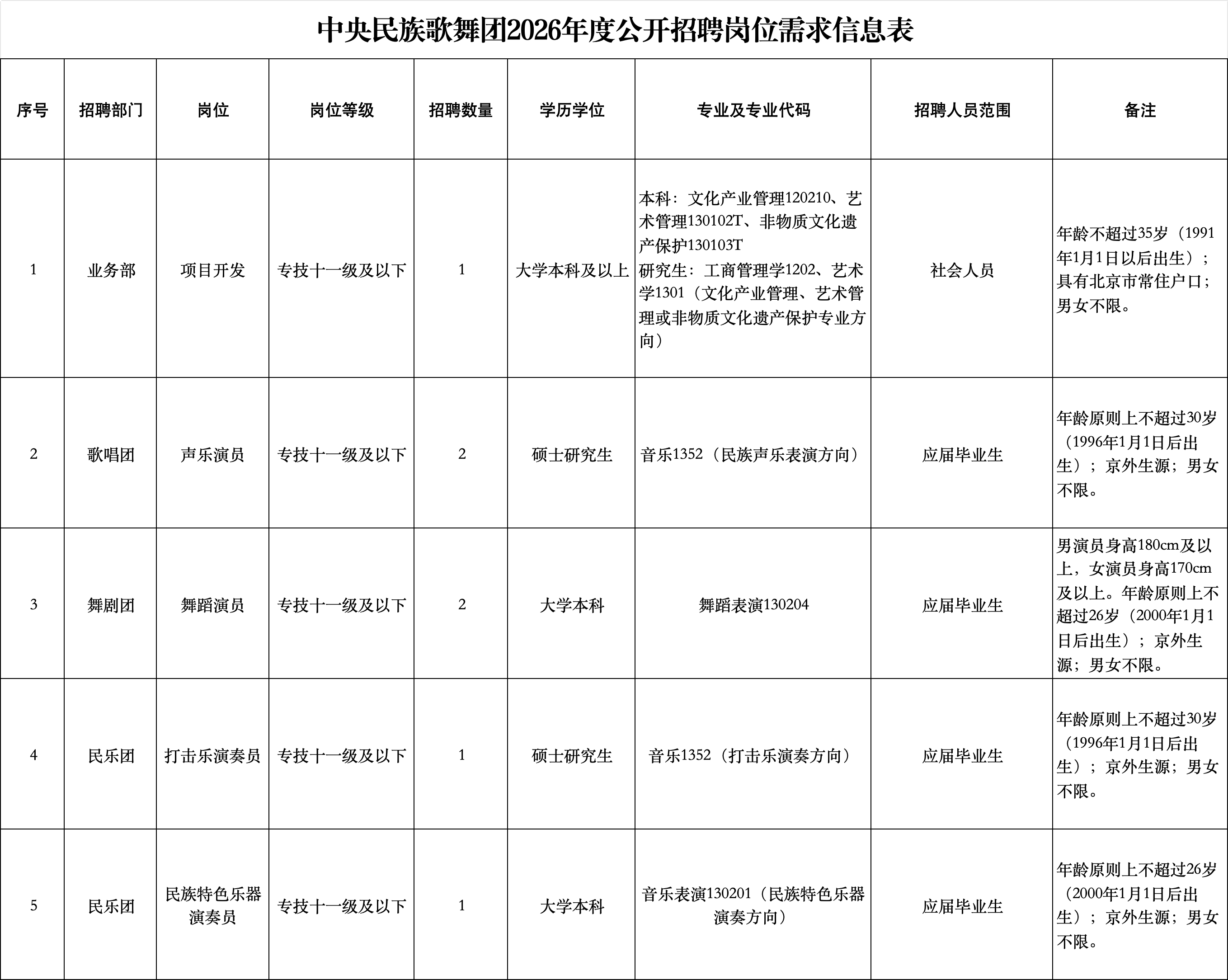具体岗位及资格条件详见《中央民族歌舞团2026年度公开招聘岗位需求信息表》(附件1)。