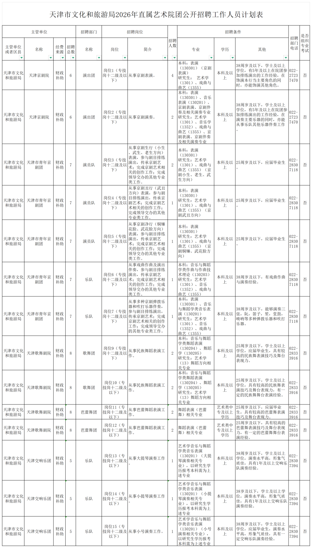 咨询电话:各招聘岗位考务咨询电话详见《天津市文化和旅游局2026年直属艺术院团公开招聘工作人员计划表》