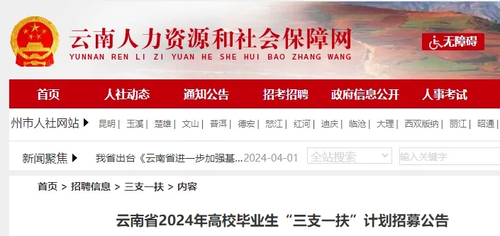 云南省2024年高校毕业生“三支一扶”计划招募公告