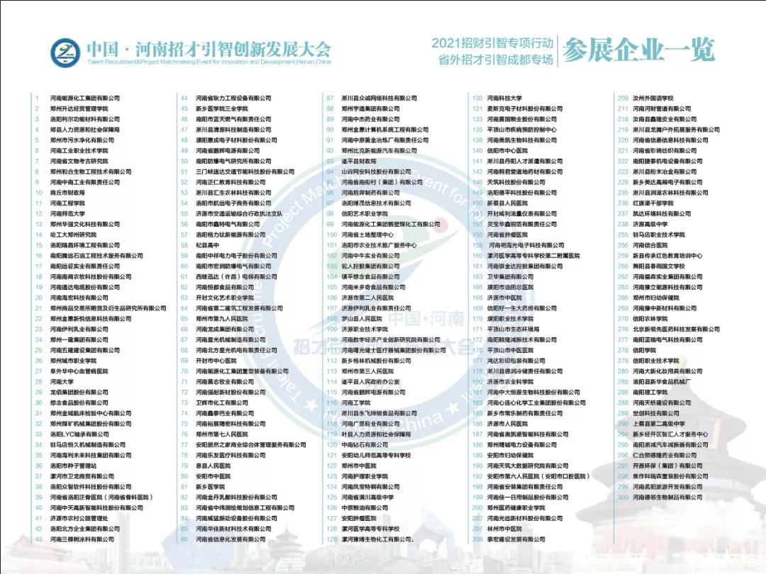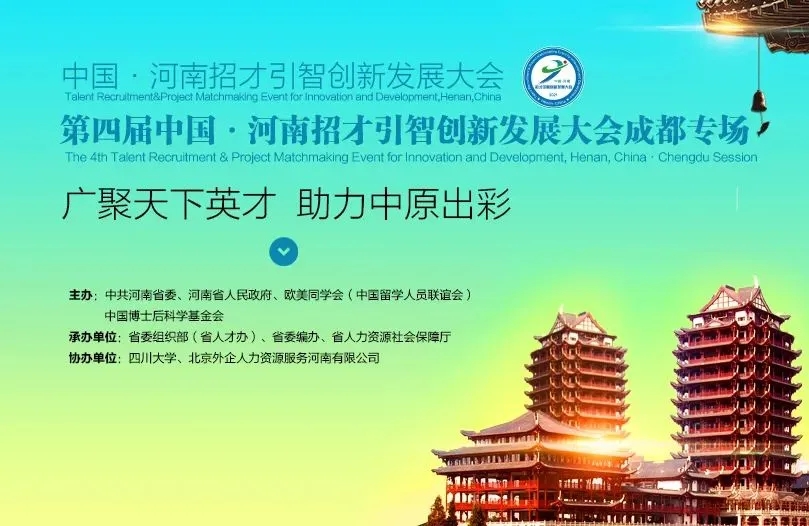 第四届中国·河南招才引智创新发展大会省外招才引智系列活动——成都专场招聘会由中共河南省委、河南省人民政府、欧美同学会(中国留学人员联谊会)、中国博士后科学基金会主办,省委组织部(省人才办)、省委编办、省人力资源社会保障厅承办,省教育厅、省卫生健康委、省政府国资委、四川大学、北京外企人力资源服务河南有限公司等协办。