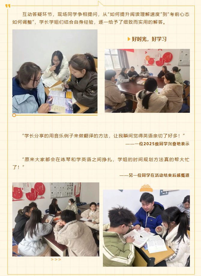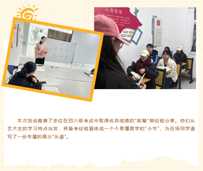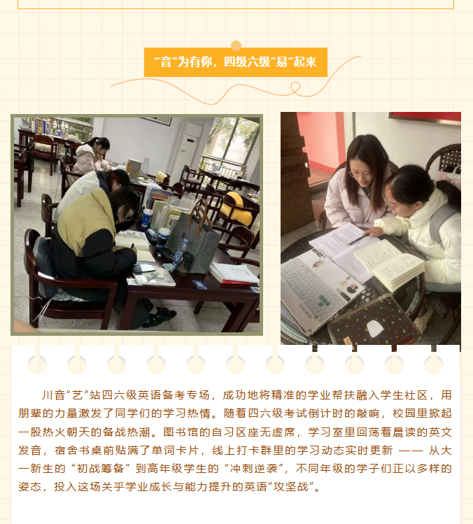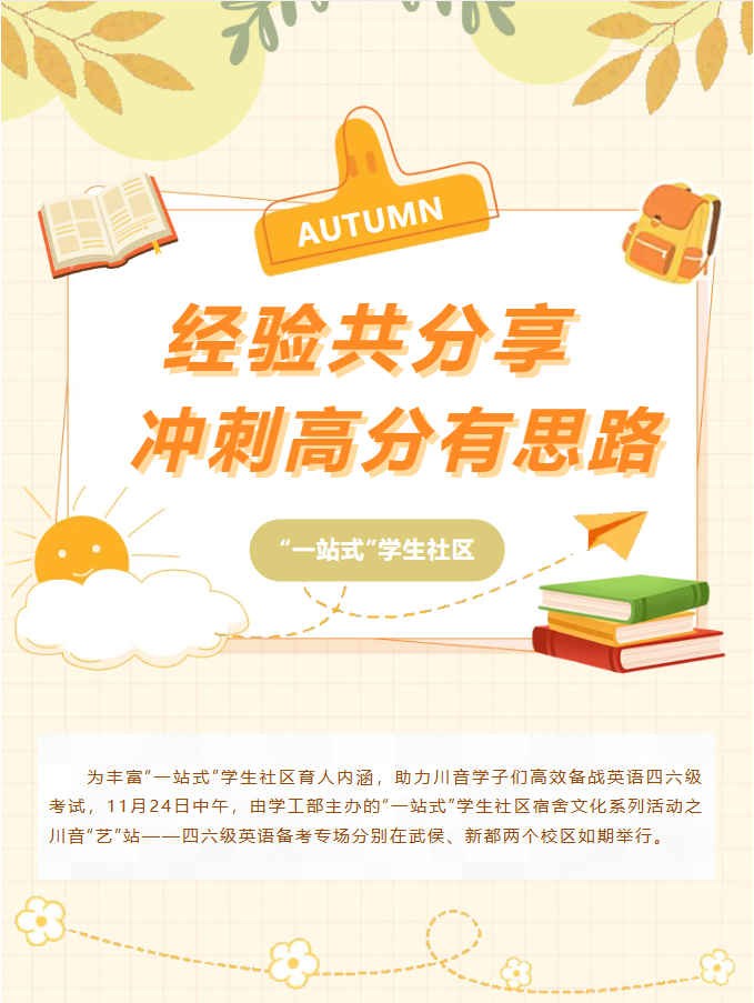 为丰富“一站式”学生社区育人内涵,助力川音学子们高效备战英语四六级考试,11月24日中午,由学工部主办的“一站式”学生社区宿舍文化系列活动之川音“艺”站——四六级英语备考专场分别在武侯、新都两个校区如期举行。