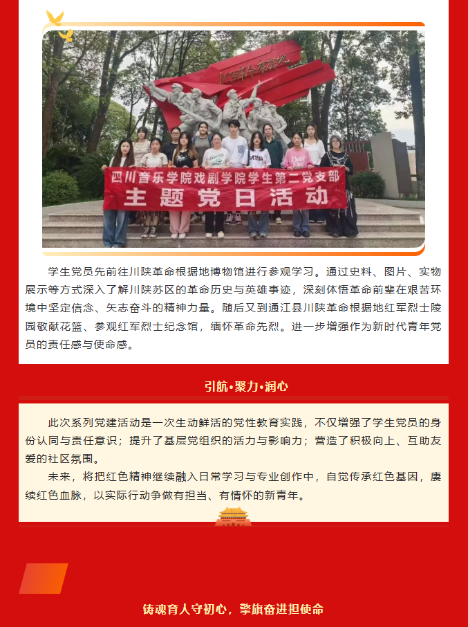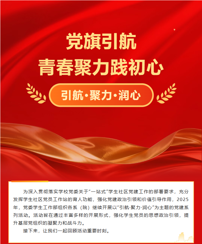 为深入贯彻落实学校党委关于“一站式”学生社区党建工作的部署要求,充分发挥学生社区党员工作站的育人功能,强化党建政治引领和价值引导作用,2025年,党委学生工作部组织各系(院)继续开展以“引航·聚力·润心”为主题的党建系列活动。活动旨在通过丰富多样的开展形式,强化学生党员的思想政治引领,提升基层党组织的凝聚力和战斗力。