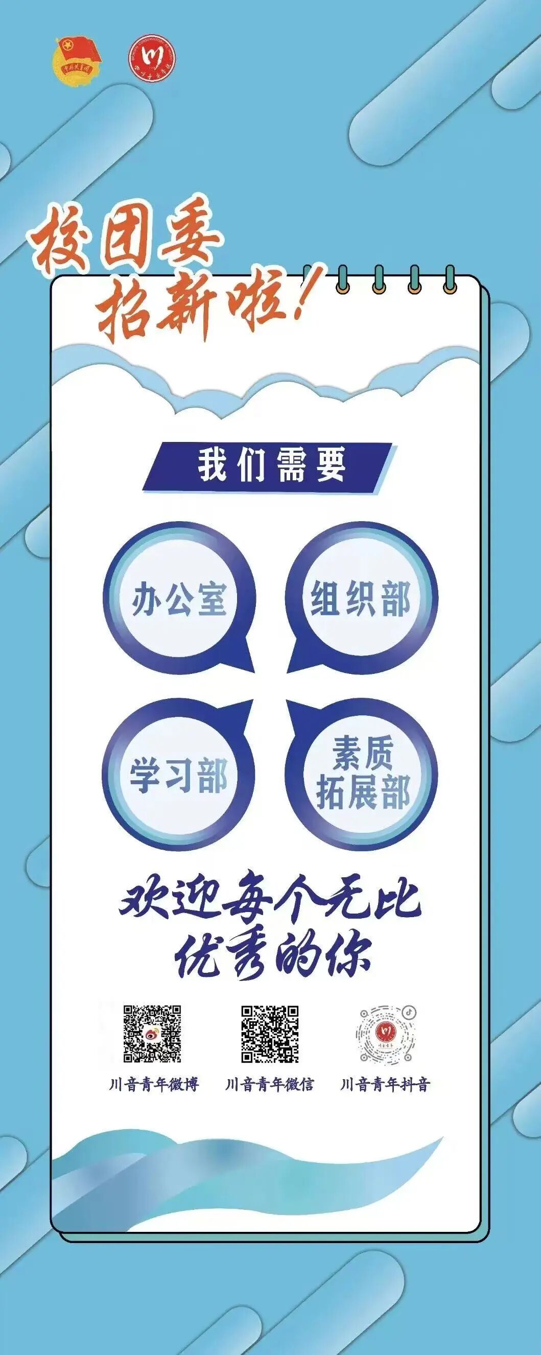 在丹桂飘香、满载憧憬的时节里,川音校级团学组织向每一位怀揣热忱的你张开双臂。在这里,你将遇见志同道合的伙伴,在团队协作中碰撞火花,在实践舞台上大放异彩,一起收获成长与蜕变!你的专属席位以虚位以待,让我们共同谱写这段璀璨的大学华章!