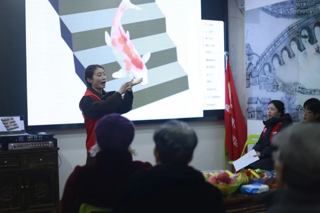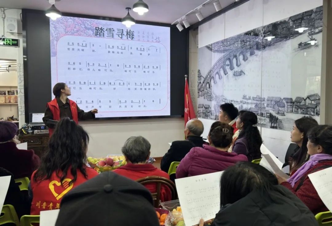 川音青年进行了音乐教学分享活动,帮助老人提高对音乐的兴趣,通过小游戏帮助老人熟练音符,增加学习的趣味性,让老人更加深入地理解音乐知识,更直观地感受唱歌的乐趣。在完成教学后,志愿者和社区老人共同合唱了《踏雪寻梅》,将拍手、跺脚与唱歌相结合,使老人在活动中更容易参与进来,增强对音乐的兴趣。这些方法结合了理论教学、互动游戏和实践练习,让老人在轻松愉快的氛围中感受音乐的魅力,提高他们对音乐的兴趣和参与度,有助于他们情感的输出与寄托,让人忘掉烦恼、舒缓情绪。